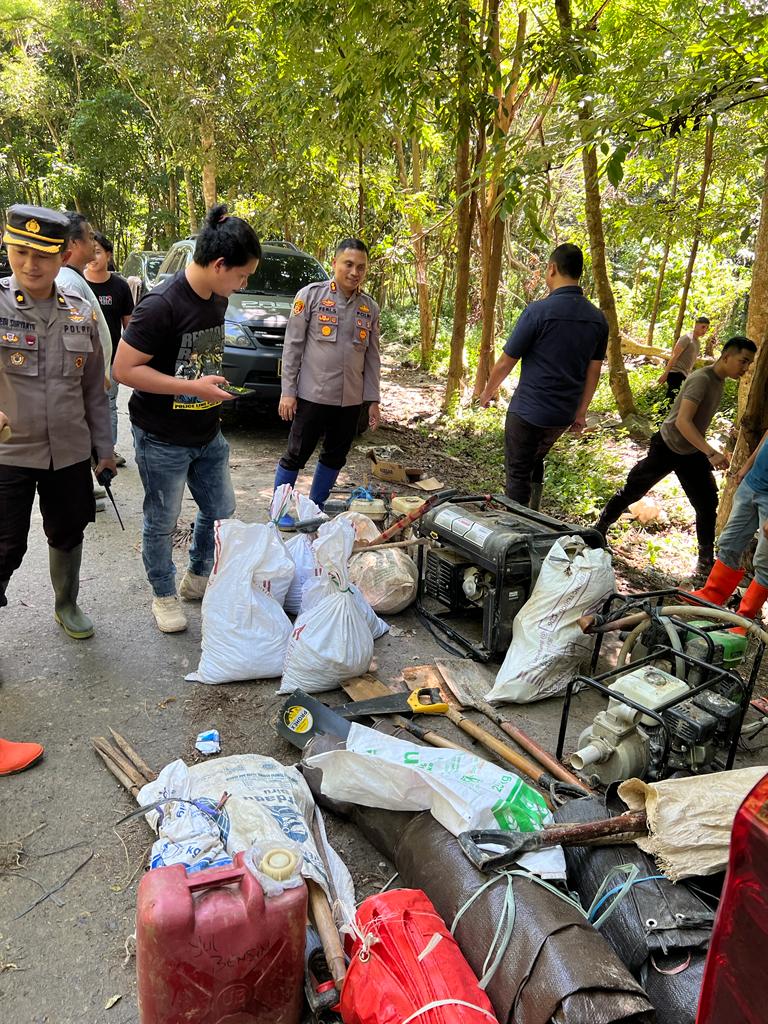 Dan ditemui saat melakukan penertiban PETI, tidak adanya kegiatan pertambangan, namun hanya ditemukan bak atau rendaman bekas kegiatan pertambangan beserta dengan alat pertambangan manual berupa Genset 1 (satu) buah, Alkon atau Pompa 5 (lima) buah, Sekop 10 (sepuluh) buah, Linggis 10 (sepuluh) buah, Terpal 5 (lima) buah, material tanah 6 (enam) karung.