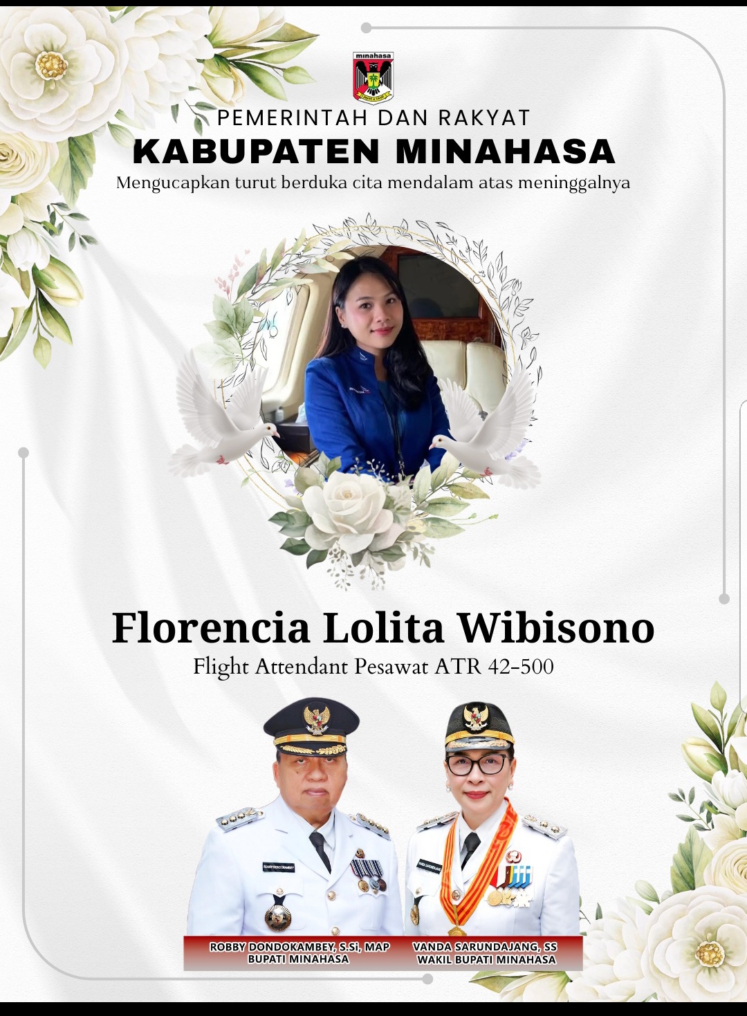 MONITORSULUT, Minahasa-Pemerintah Kabupaten Minahasa di bawah kepemimpinan Bupati Robby Dondokambey, S.Si, MAP dan Wakil Bupati Vanda Sarundajang, SS menyampaikan belasungkawa yang mendalam atas wafatnya Pramugari Florencia Lolita Wibisono (33), salah satu korban dalam kecelakaan pesawat ATR 42-500 PK-THT yang terjadi di kawasan Gunung Bulusaraung, Kabupaten Pangkep, Provinsi Sulawesi Selatan.