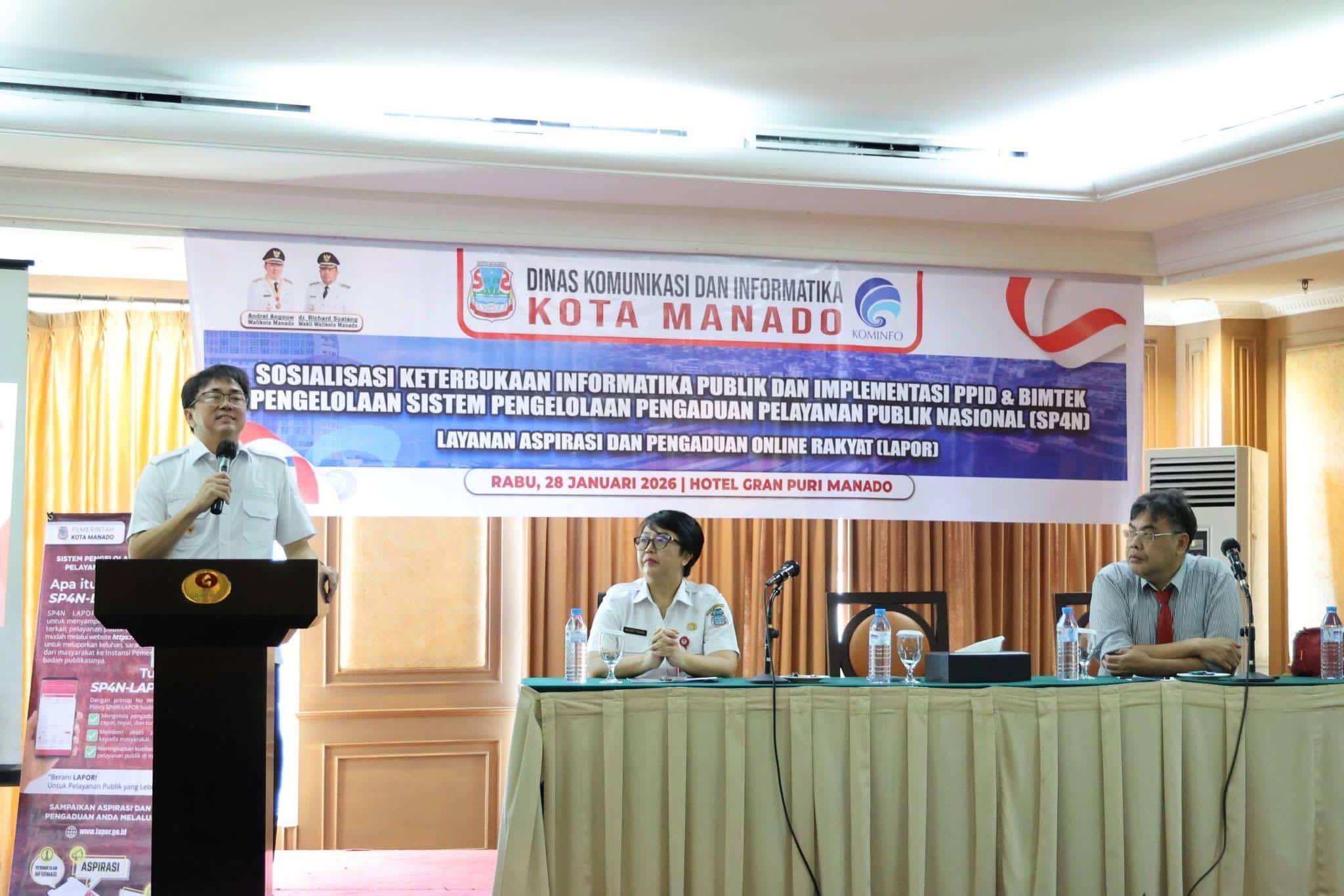 MONITORSULUT.COM, MANADO – Wali Kota Manado Andrei Angouw membuka secara resmi kegiatan Sosialisasi Keterbukaan Informasi Publik dan Implementasi Pejabat Pengelola Informasi dan Dokumentasi (PPID) serta Bimbingan Teknis Sistem Pengelolaan Pengaduan Pelayanan Publik Nasional (SP4N)–Layanan Aspirasi dan Pengaduan Online Rakyat (LAPOR), Rabu (28/1/2026), di Hotel Grand Puri Manado.